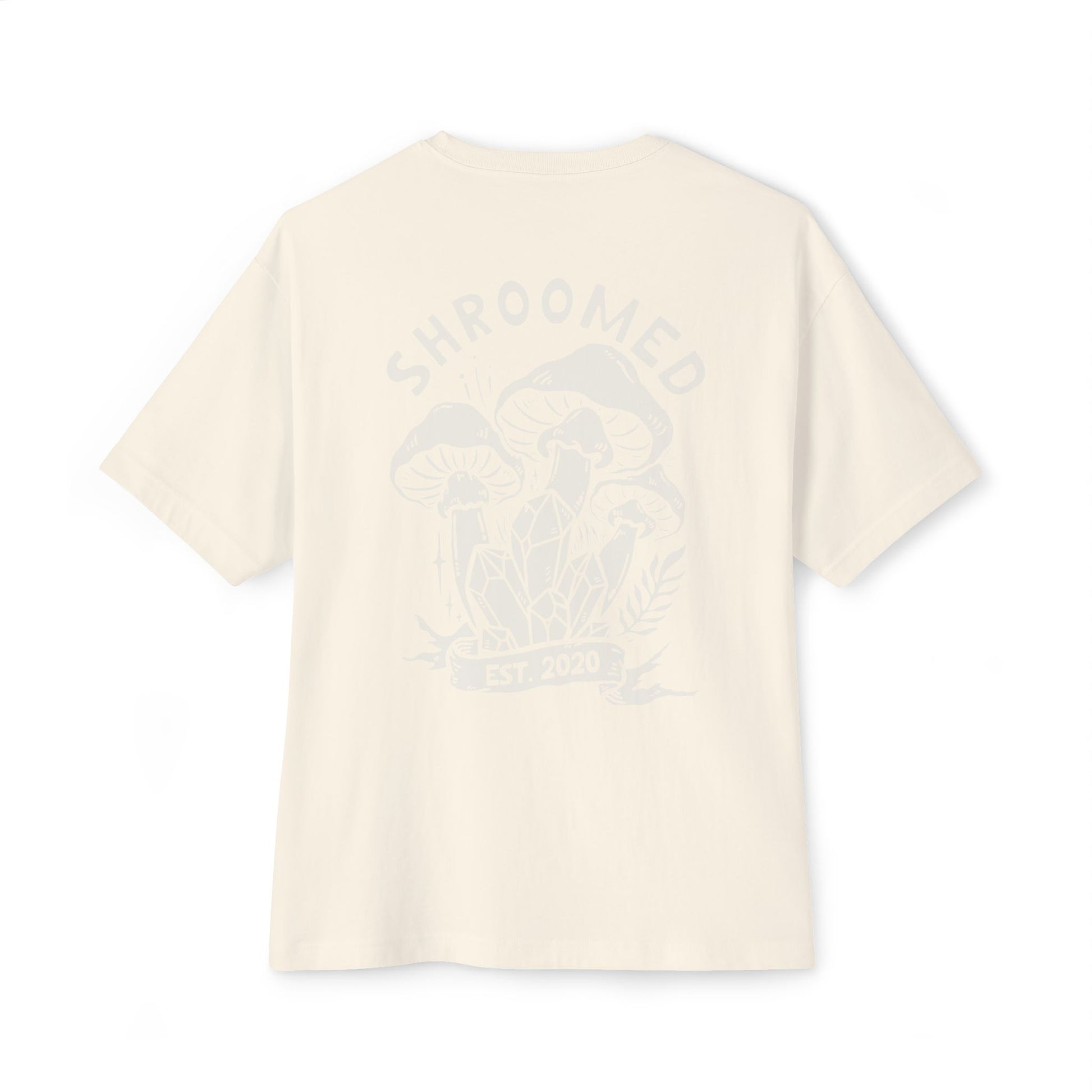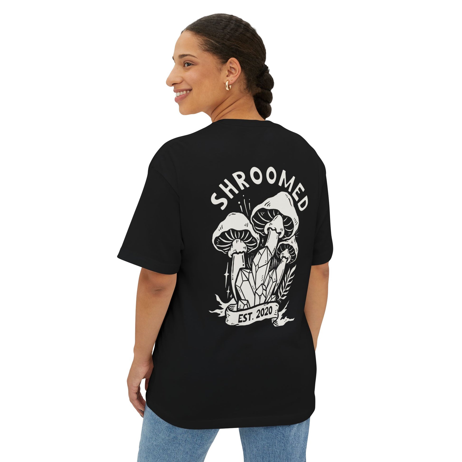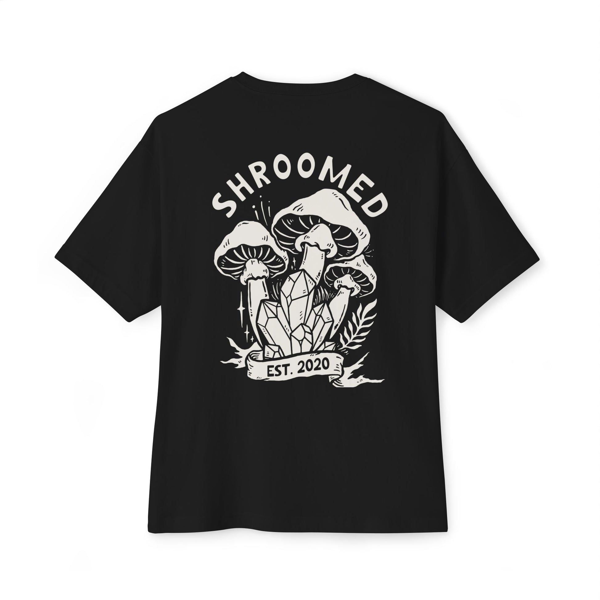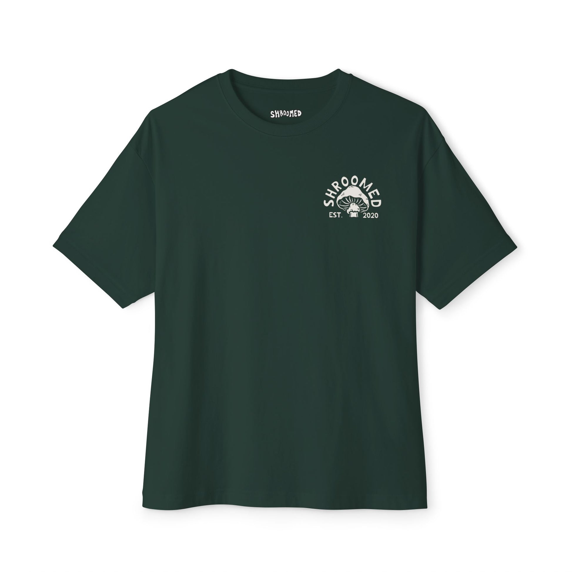 This relaxed boxy tee brings a playful, slightly mischievous energy to slow afternoons and late-night hangouts. A small, colorful mushroom patch rests over the heart, while the back reads with hand-drawn flair: “EAT MOR SHROOMS” and a rainbow “SHROOMED” accent—equal parts tongue-in-cheek and nostalgic festival art. The loose, dropped-shoulder silhouette drapes easily over jeans or layered under an open flannel. Wear it to backyard bonfires, record-store hunts, or art-market outings when you want something comfortable that still sparks conversation. The soft, midweight cotton feels lived-in from the first wear, and the tear-away label keeps the neckline smooth. It’s the kind of shirt that settles into your rotation and becomes the one friends instantly recognize.