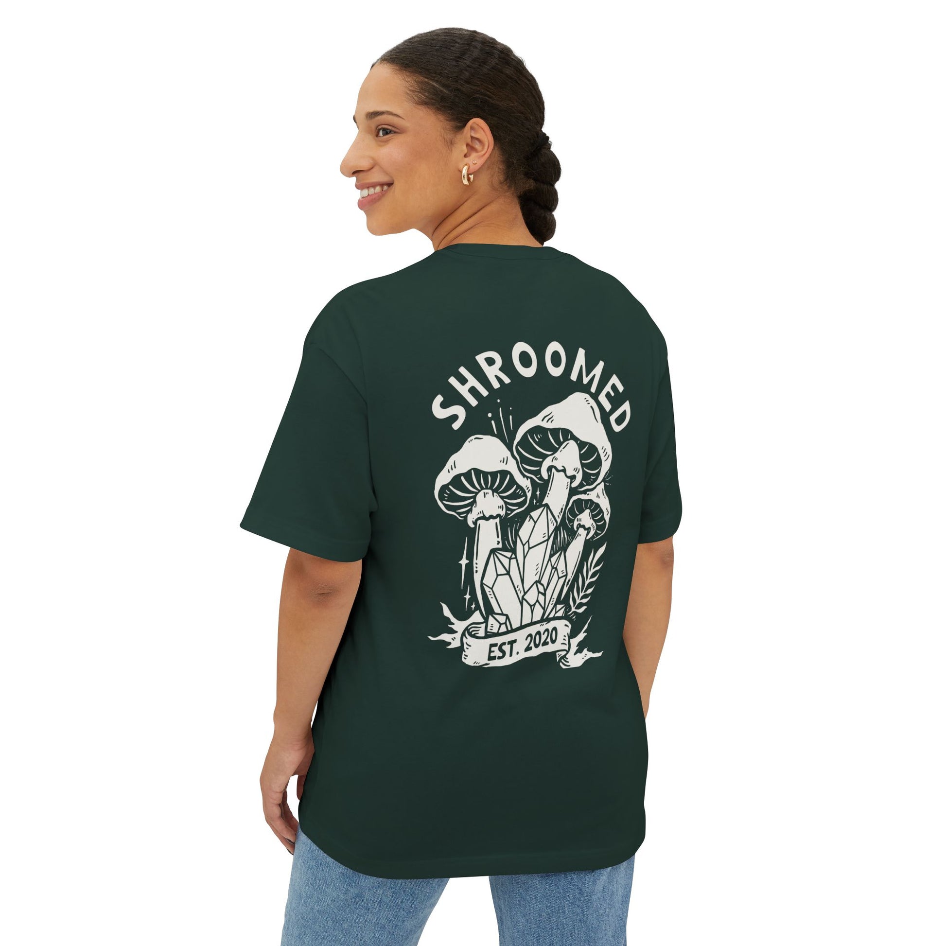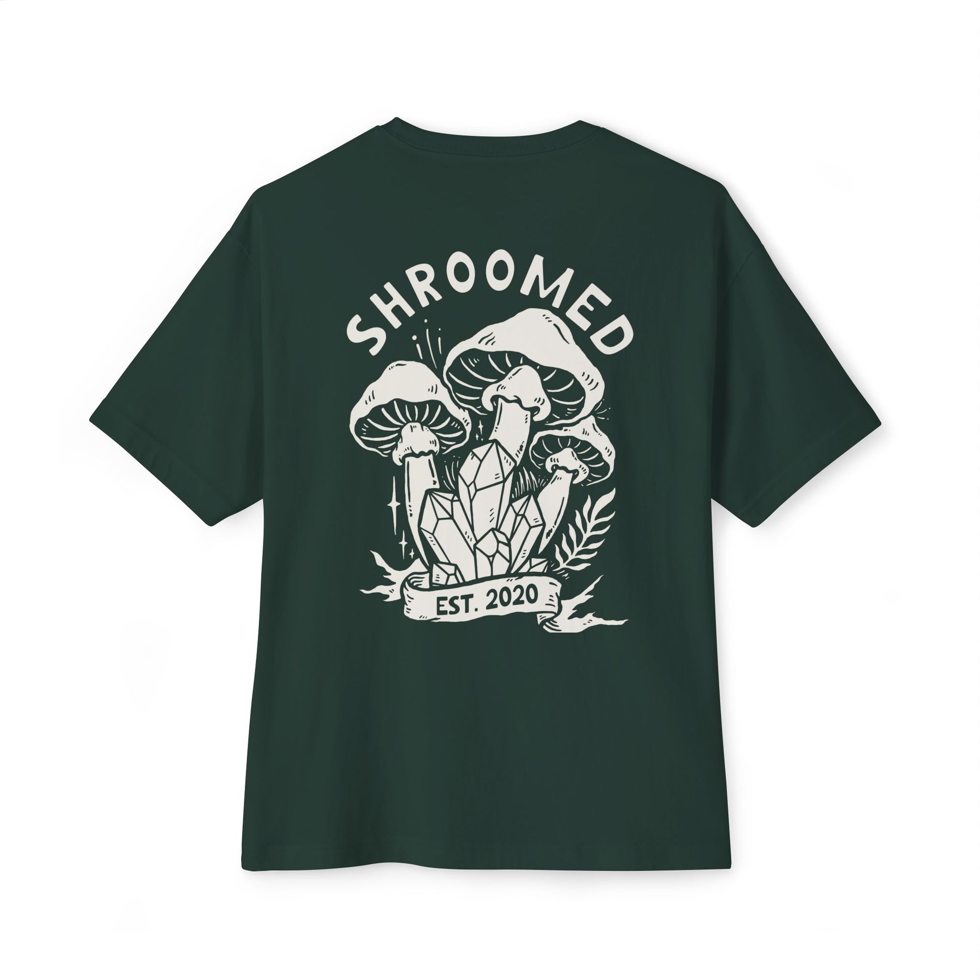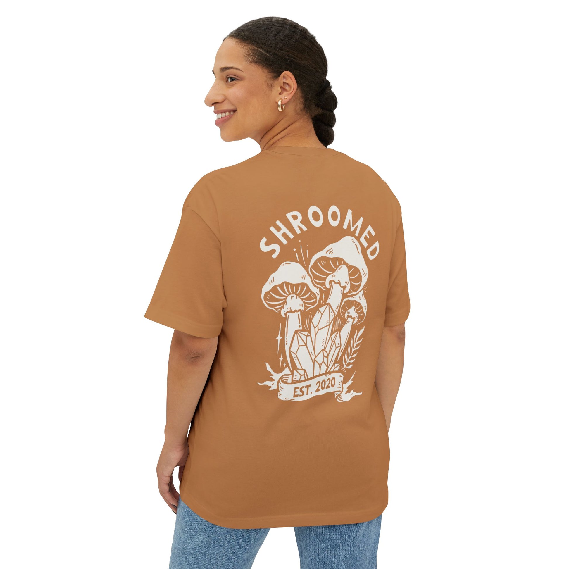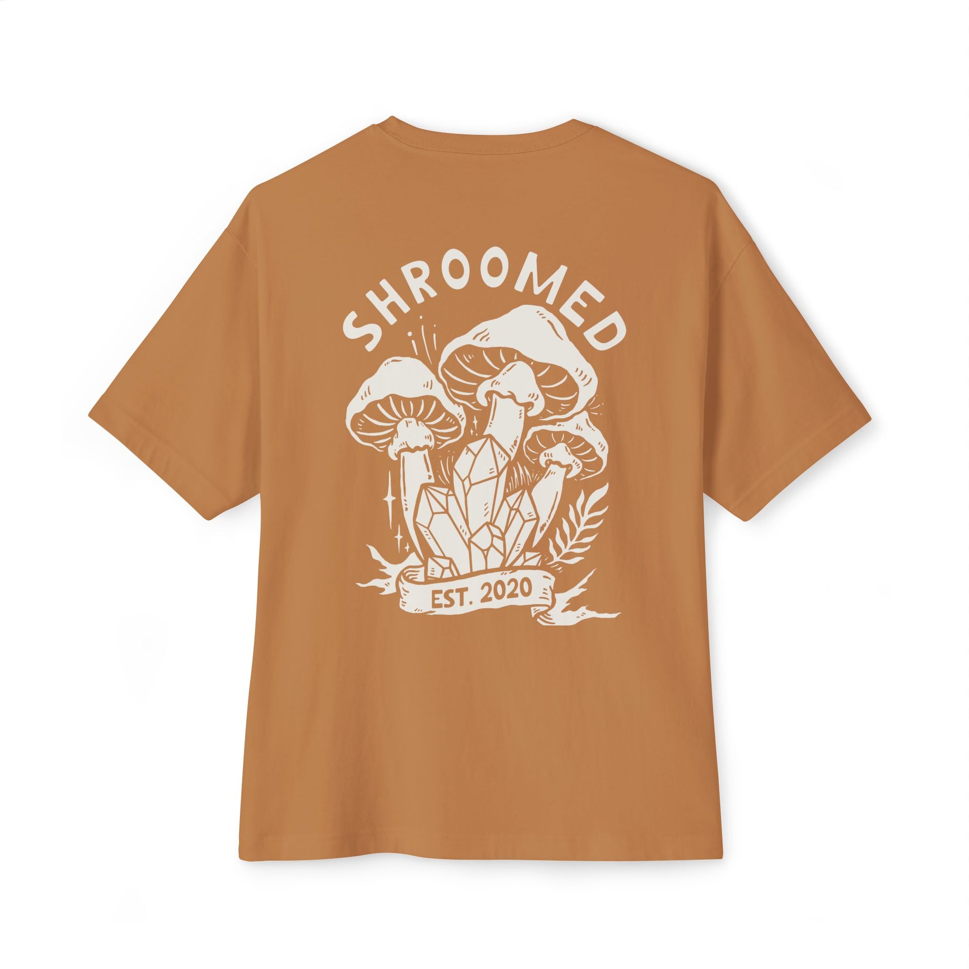 This relaxed boxy tee brings a playful, slightly mischievous energy to slow afternoons and late-night hangouts. A small, colorful mushroom patch rests over the heart, while the back reads with hand-drawn flair: “EAT MOR SHROOMS” and a rainbow “SHROOMED” accent—equal parts tongue-in-cheek and nostalgic festival art. The loose, dropped-shoulder silhouette drapes easily over jeans or layered under an open flannel. Wear it to backyard bonfires, record-store hunts, or art-market outings when you want something comfortable that still sparks conversation. The soft, midweight cotton feels lived-in from the first wear, and the tear-away label keeps the neckline smooth. It’s the kind of shirt that settles into your rotation and becomes the one friends instantly recognize.