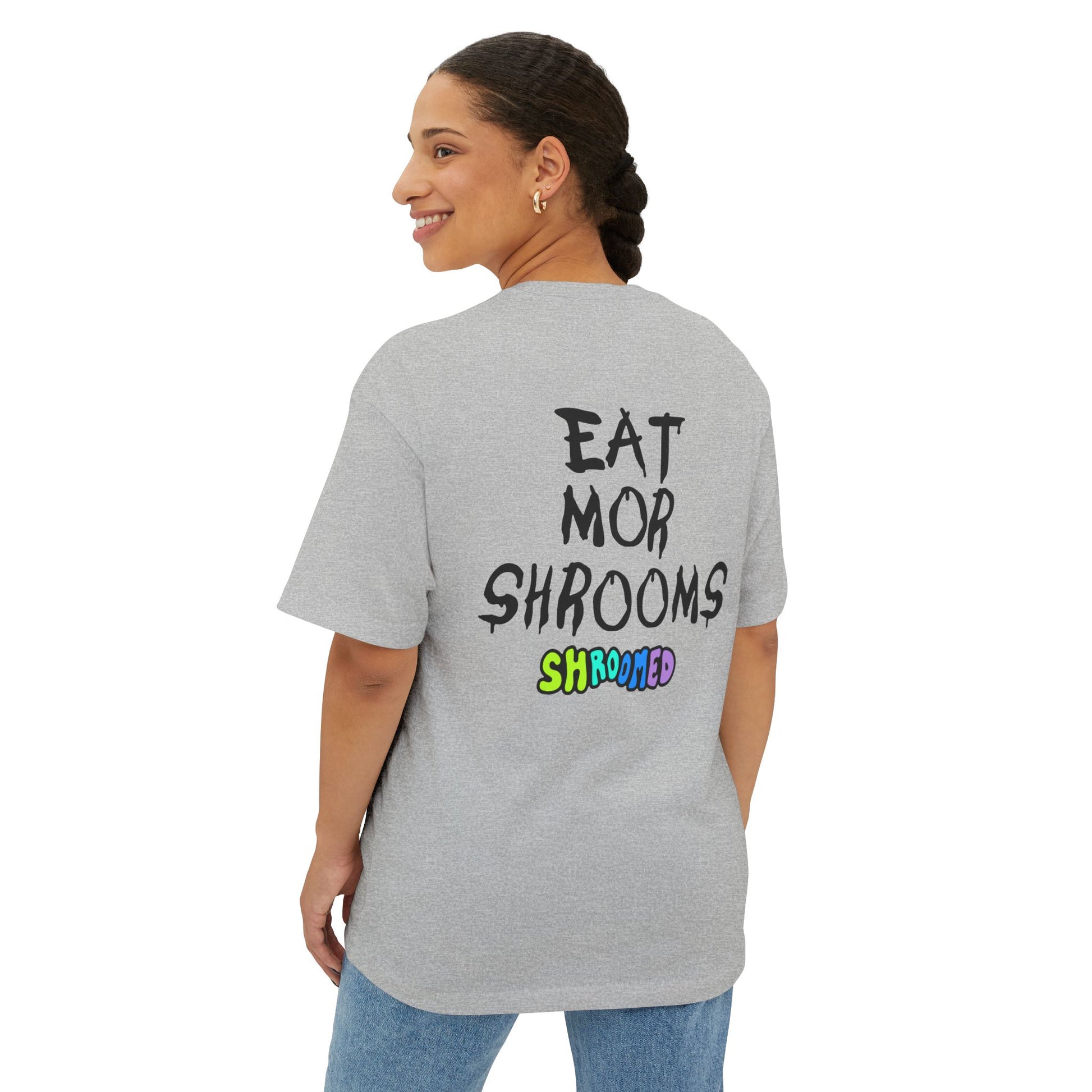 This relaxed boxy tee brings a playful, slightly mischievous energy to slow afternoons and late-night hangouts. A small, colorful mushroom patch rests over the heart, while the back reads with hand-drawn flair: “EAT MOR SHROOMS” and a rainbow “SHROOMED” accent—equal parts tongue-in-cheek and nostalgic festival art. The loose, dropped-shoulder silhouette drapes easily over jeans or layered under an open flannel. Wear it to backyard bonfires, record-store hunts, or art-market outings when you want something comfortable that still sparks conversation. The soft, midweight cotton feels lived-in from the first wear, and the tear-away label keeps the neckline smooth. It’s the kind of shirt that settles into your rotation and becomes the one friends instantly recognize.